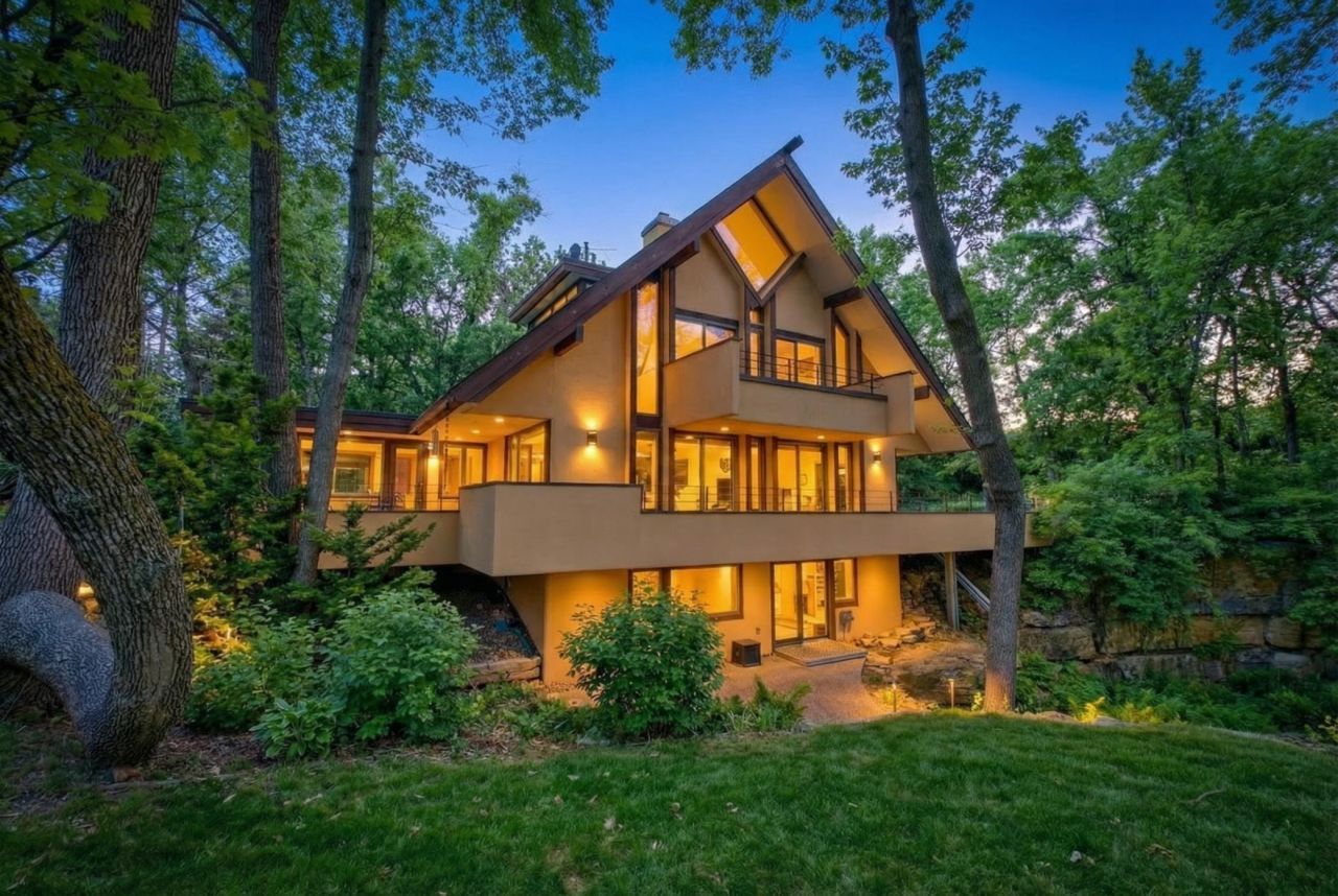 Designed by architect Sala and perched high above the St. Croix River, this one-of-a-kind Stillwater bluff home offers a living experience that is unmatched. Thoughtfully designed across four levels, the home blends architecture and function with remarkable detail throughout. The main level features a living room with wood-burning fireplace and sliding glass doors, a dining area, and a wraparound deck connecting multiple outdoor sitting areas, including a four-season porch and north garden retreat. The kitchen includes a breakfast nook with built-in seating and extensive custom built-ins throughout the home. The private primary suite has its own level, highlighted by vaulted ceilings, a unique open connection to the main living space, and a private balcony perfect for sunrise views. The fully updated primary bath features a skylight, glass-enclosed shower, and refined finishes, along with a spacious walk-in closet and adjacent laundry and office nook. At the top, the 'Eagle's Nest offers a serene escape with distinctive diamond-shaped windows and panoramic river views?ideal for a studio, office, or creative space. The walk-out lower level serves as a guest retreat with a bedroom, updated bath, sauna, and access to a tranquil pond setting. Additional features include a heated 3-car garage with Level 2 EV charging, newer mechanicals, and a shared driveway. A rare opportunity to own a truly distinctive home in one of Stillwater's most iconic settings.