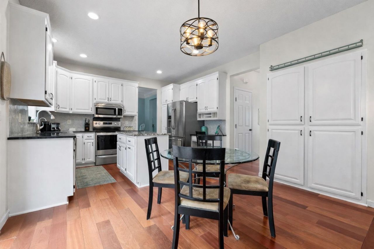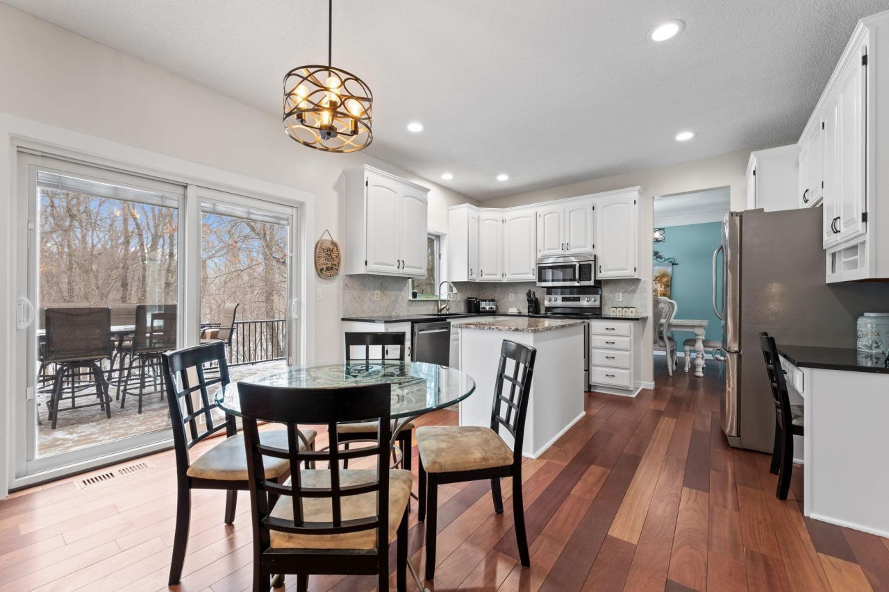Welcome home to the highly sought-after Lafayette Woods neighborhood. If you want private views with trees from every window, you have come to the right place! The main level offers both formal and informal dining spaces, a spacious kitchen with center island, a cozy family room with a beautiful stone fireplace, and a versatile flex space just off the formal dining room?perfect for a home office, sitting room, playroom, or whatever best fits your lifestyle. A convenient main-level laundry room located just off the oversized garage adds everyday functionality along with a half bath woof floors throughout! Upstairs, the owner's suite features wood floors, a walk-in closet with a custom closet organizer added in 2024 (over $5,000), and a private bath with dual sinks plus a separate tub and shower. Three additional bedrooms and a full bathroom complete the upper level. The finished walkout lower level provides exceptional additional living space, including a large family room, oversized fifth bedroom, and a full bathroom?ideal for guests or flexible living needs. Massive storage room!Major updates include new roof and siding in 2021, and in 2024 a new high-end furnace, air conditioner, water heater, water softener, and Aquarius water treatment/reverse osmosis system. Additional highlights include Fresh paint throughout and professionally finished cabinets (2026) give the home a bright, updated feel. Enjoy a huge maintenance-free deck, and gorgeous wooded views from both the front door and the private, serene, wooded backyard that has an invisible fence already in place. Located under five minutes from all Elk River schools, with shopping, dining, and everyday conveniences close by, this home offers the perfect blend of space, updates, and location.