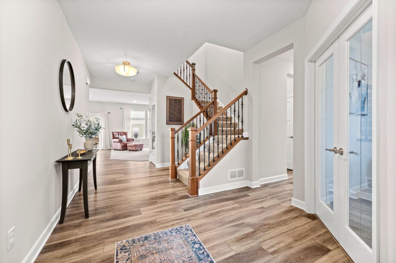 Welcome home to this beautiful property nestled on a quiet cul de sac in a fantastic neighborhood, just a short walk to Victoria Elementary School. Enjoy the convenience of being only a quick golf cart ride to Deer Run Golf Course.Step inside to a grand entry featuring a wrought iron staircase. The main level showcases white cabinetry and woodwork, quartz countertops, custom tile backsplash, under cabinet lighting, an oversized center island, GE slate appliances, and a spacious walk in pantry. A 3 car garage connects to a functional mudroom with a walk in closet.Enjoy the flat backyard and expansive deck, perfect for outdoor living. The main floor also includes a private study with glass French doors and a spacious family room with a gas fireplace and soaring ceilings.Upstairs offers four generous bedrooms, convenient laundry, and a vaulted primary suite. The luxurious primary bath features tile finishes, a soaking tub, separate shower, double sinks, and a large walk in closet.The finished lower level with daylight windows provides additional living space with a large family room, bedroom, bathroom, and excellent storage.