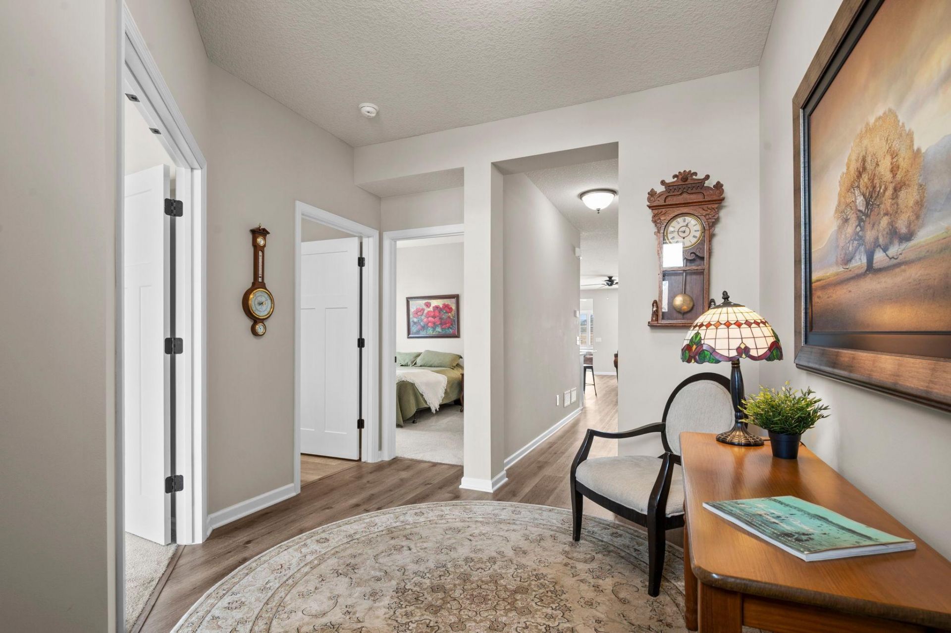Beautiful, move-in ready home offering effortless single-level living in a peaceful Corcoran setting. Ideally located near golf courses, parks, trails, and abundant outdoor recreation, with quick access to shopping and major roads, blending everyday convenience with a sense of retreat.Step inside to an open, light-filled layout designed for comfortable living and easy entertaining. 9-ft ceilings and expansive windows create a bright, airy atmosphere throughout. The inviting living room features a stunning gas fireplace and serene views of surrounding greenspace, while sleek, continuous flooring enhances the home's seamless flow.The spacious kitchen is the heart of the home, showcasing quartz countertops, stainless steel GE appliances, a large center island with breakfast bar seating, and a walk-in pantry with generous storage. Nearby, the informal dining area and sunroom shine with vaulted ceilings and abundant natural light, perfect for both quiet mornings and hosting guests.Enjoy the private patio, a perfect extension of the living space, ideal for relaxing or entertaining outdoors. The split-bedroom design offers added privacy, highlighted by a generous primary suite with a walk-in tiled shower, double vanity, and expansive walk-in closet. Two additional bedrooms provide flexible living options, complemented by a full bathroom.Complete with a spacious mudroom, laundry area, large storage area, and attached 2-car garage, this home offers the perfect blend of comfort, functionality, and effortless living.