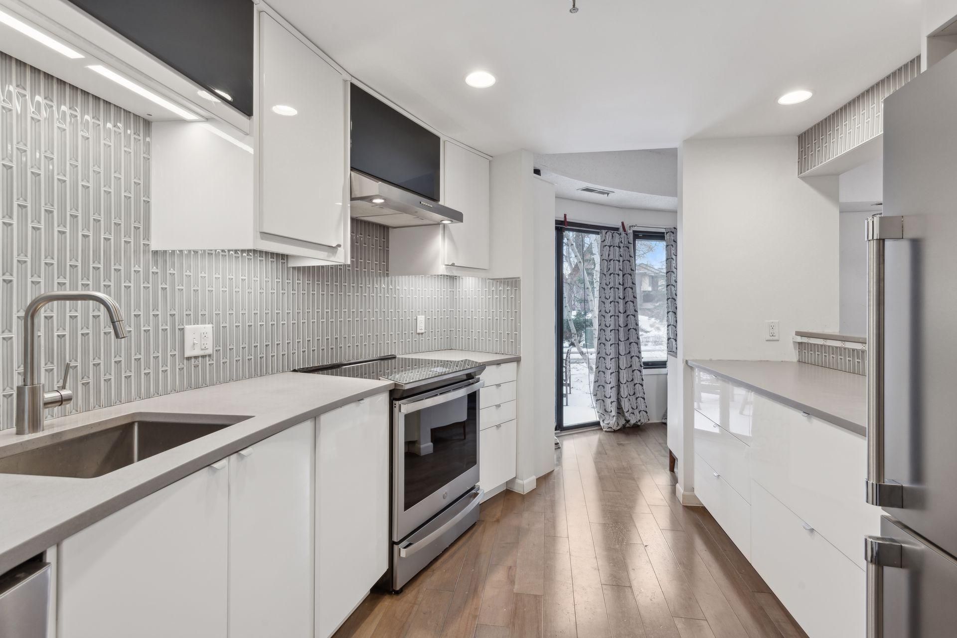 Main floor condo with private patio provides fresh air and nature right outside your door. Noise buffering concrete walls, and updated flooring throughout - hardwood on the main and vinyl on second level. The two story layout allowsfor separation between upstairs bedrooms (one with a private balcony), and an open concept main floor. The updated kitchen features stainless appliances, quartz counters, ample storage, and a convenient breakfast bar. Other featuresinclude in-unit laundry, updated electrical panel and 2 storage lockers. 3 owned parking spots (2 in the heated garage and one on surface lot) are a rare find. This vibrant complex offers easy access to nearby lakes, Greenway bike trails, shops, restaurants, and upcoming light rail which will travel underground in this area.