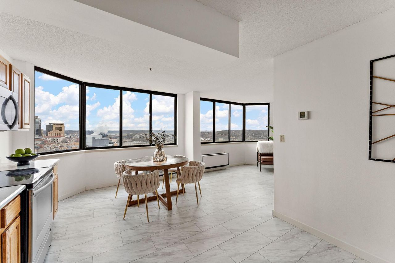 Elevate your lifestyle in this impeccable, move-in ready condo where a stunning panoramic view iscombined with a beautifully updated space that feels both luxurious and inviting.Sky high in the heart of St. Paul, enjoy a bird's eye view of gorgeous sunrises and sunsets over thehistoric Cathedral, famous Summit Ave mansions, and the backdrop of the Mississippi River with miles of treetop bluffs. The beauty of this home is something that can't be fully appreciated until you see it first-hand.Significant investments made in carefully selected upgrades and remodeling reflects a level of pride inownership and aesthetic refinement that is hard to find. From the reimagined, elongated kitchen layoutfeaturing upgraded countertops and stainless steel appliances, to refreshed paint and new flooringthroughout, a beautifully updated bathroom, and the addition of a new AC, each improvement was made to elevate everyday comfort, long-term value, and overall visual appeal.Abundant natural light pours in by day and the expansive glow of city lights amazes at night throughlarge bay windows. The interior feels open, airy, and is centered on the incredible view. Two full bedrooms and two full bathrooms provide flexibility without compromise. In-unit laundry, secure access tothe building and elevator, and an option to park in the attached garage adds convenience and peace ofmind. You'll also appreciate the stability of a strong, well-managed association that brings long-termconfidence, which is not to be overlooked in today's market!Ideally situated near dining, shopping, entertainment, parks, and major routes, this home keeps you close to everything you enjoy while having a beautiful oasis to come home to. Schedule your private showing today and experience it for yourself.