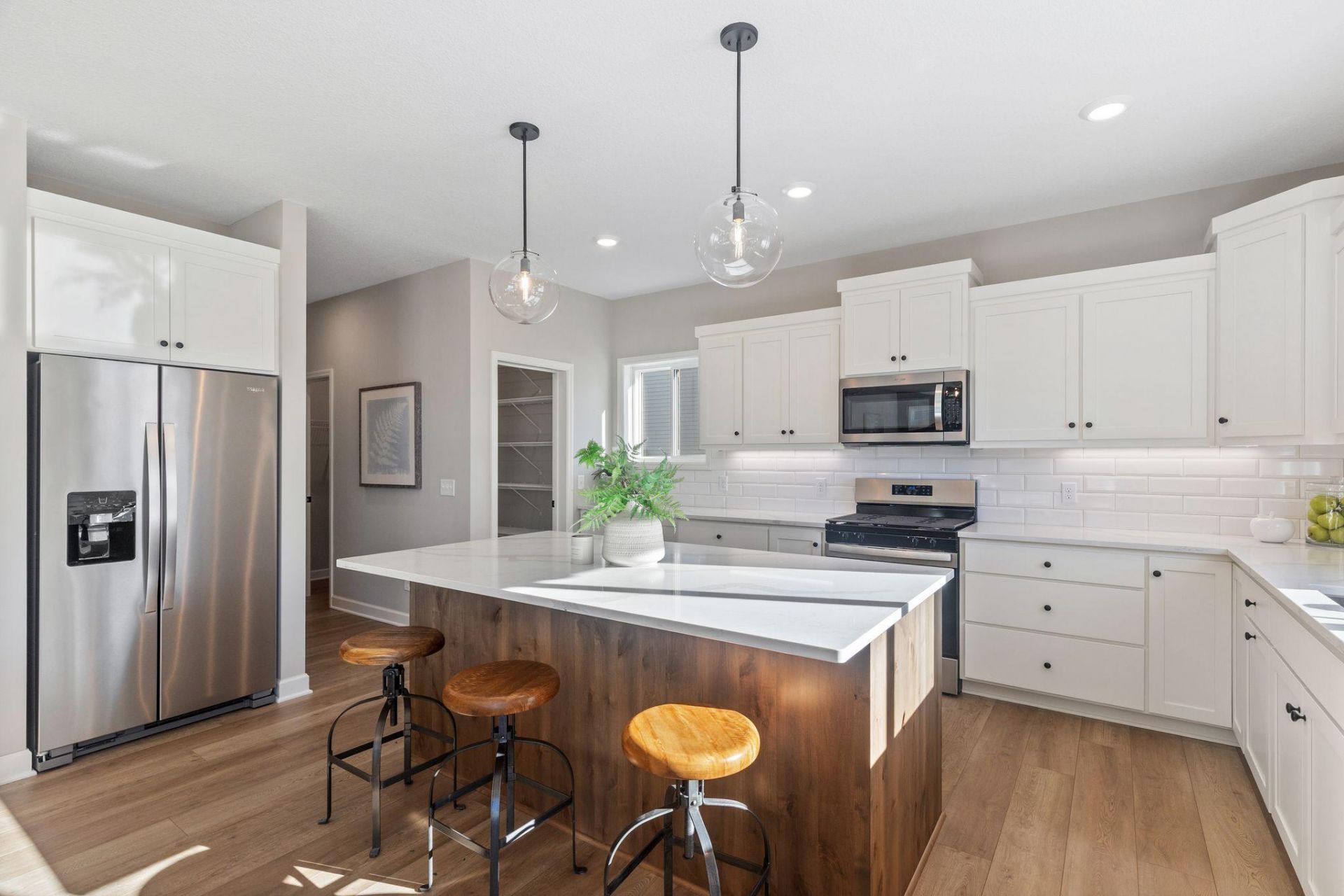 Home is complete and available for sale. Other models, plans, homesites and Quick Move-in homes may be available. Welcome to the Payton XL plan by OneTenTen Homes, a beautifully crafted two-story home offering five spacious bedrooms, four bathrooms, and a three-car garage. The main level features a sunlit kitchen with a large center island, walk-in pantry, and an office. The primary bedroom, with its vaulted ceiling, includes an ensuite bathroom with double sinks and a walk-in shower. The finished walkout lower level adds versatile living space. Elegant painted millwork, rich stained wood, oversized windows, and custom cabinets with quartz countertops showcase the home's exceptional quality and attention to detail.