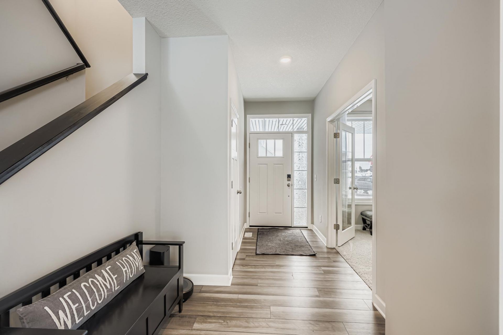 This beautiful two-story home features 4 bedrooms on one level with a private laundry room on the same level. There are 2 full bathrooms also on the upper level. The private bathroom in the primary bedroom features dual sinks, bathtub and separate shower. Themain level office, with french doors, faces the front yard. The main level includes a large living room with a beautiful gas fireplace, recessed lighting and large windows overlooking the private backyard. The spacious dining room with patio door walks out to the fully fenced backyard. The kitchen has an abundance of cabinets, tons of space on the quartz countertops, slate appliances, walk-in pantry and a large center island. There is a half bathroom conveniently located near the kitchen as well.Upgrades include new water softener (2023), front load washer/dryer on pedestals (2023), Bosch dishwasher (2025), full chain link fencing in the backyard, gutters and window wells, custom shelving in owner's suite and mud room, double closet racks in 3 bedrooms and the garage painted and shelving added.This home is situated on over a half acre lot in a wonderful Andover neighborhood.