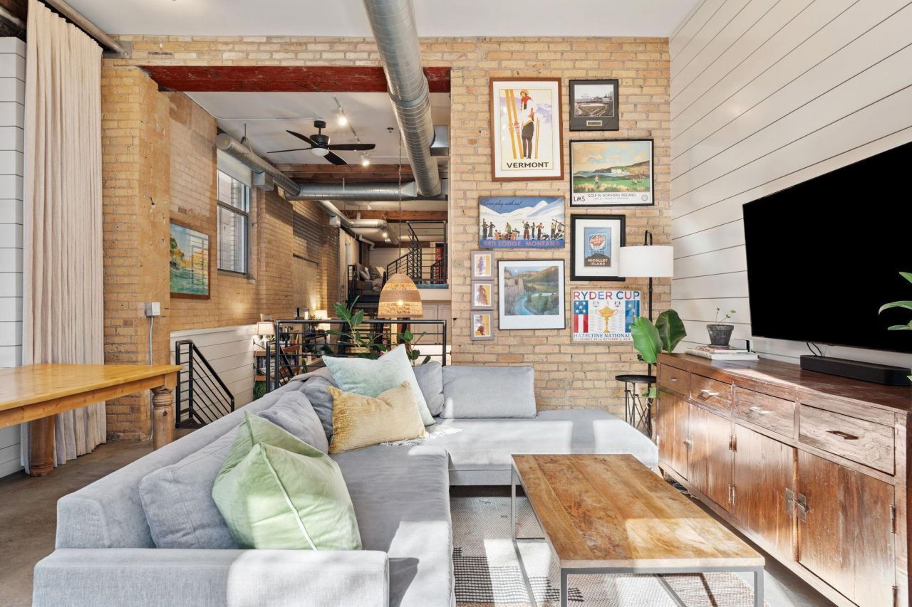 Welcome to North Loop living in this coveted corner unit at 801 Lofts, a truly one-of-a-kind residence with custom finishes throughout. Polished concrete floors, exposed brick, and wood beams are beautifully balanced by shiplap accents and open shelving. The entry-level den offers flexible use as an office or lounge, complete with a large walk-in closet and in-floor heat. The expanded kitchen features ample cabinetry, generous prep space, and a full suite of retro-style Big Chill appliances with a convenient eat-in area. Upstairs, the primary suite overlooks the main level and includes a playful en suite and catwalk to a spacious walk-in closet. Soaring ceilings lead to a sun-drenched living room with southern exposure and a striking floor-to-ceiling brick corner fireplace. French doors open to a private patio with exclusive access to an approximately 1,800 square foot historic boiler room on the lower level, an incredible opportunity for a studio, gym, or creative space. A rare and distinctive North Loop offering.